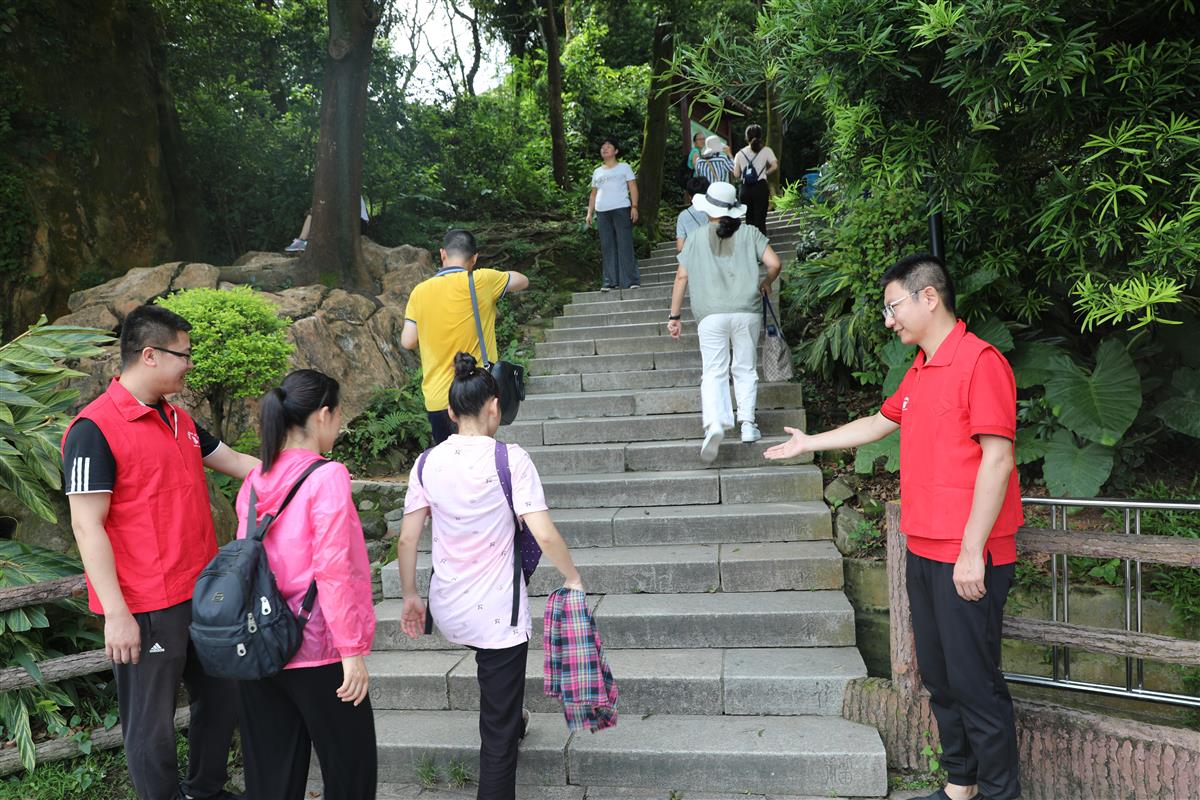 郁翠蒼松,火紅楓葉,百里爭艷,疑似鳳凰落九洲。7月6日上午,潔亞黨支部、義工隊(duì)穿著火紅的義工服,化身“一只只火鳳凰”,穿梭于鳳凰山中,為前來觀光的游客提供指引服務(wù),幫助游客更好地找到登山的路和各景點(diǎn)的方位,并提醒游客愛護(hù)森林,保護(hù)環(huán)境。