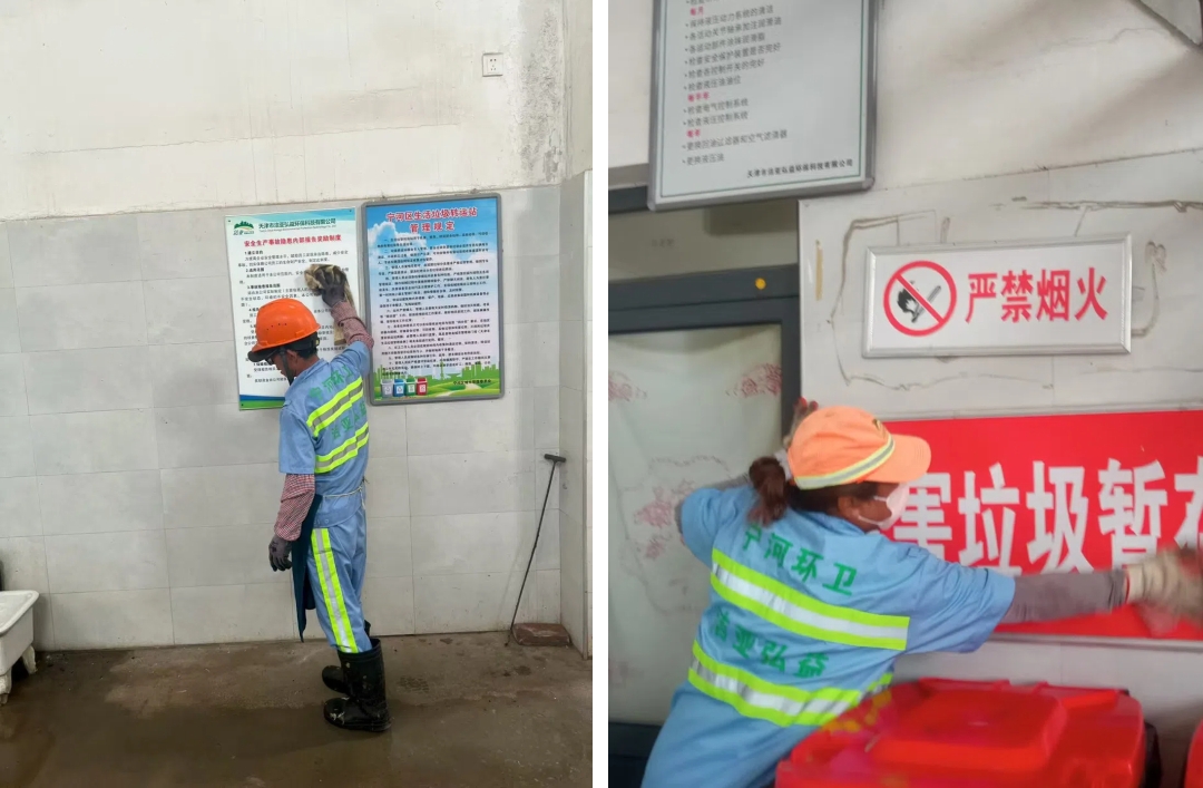 垃圾中轉(zhuǎn)站是城市靜脈的“樞紐”,也是來賓觀察城市治理的“第一眼”。潔亞環(huán)保聚焦標(biāo)識標(biāo)牌、制度公示、環(huán)境衛(wèi)生三大環(huán)節(jié),對寧河區(qū)11座中轉(zhuǎn)站進行“拉網(wǎng)式”提升。針對站內(nèi)基礎(chǔ)設(shè)施,工作人員對標(biāo)識標(biāo)牌、制度公示牌進行全面清理與維護:徹底擦拭入口指示標(biāo)識確保清晰醒目;逐一檢查墻面懸掛的工作標(biāo)準(zhǔn)與制度文件,更換破損頁面并重新固定,同步清除墻面蛛網(wǎng)與積灰,讓中轉(zhuǎn)站以規(guī)范有序的形象迎接各方目光。