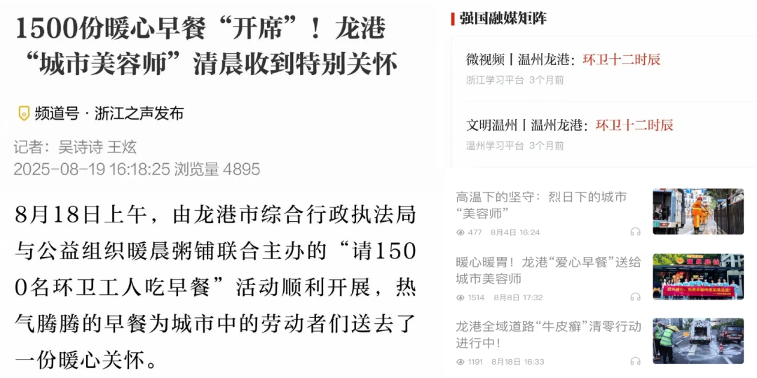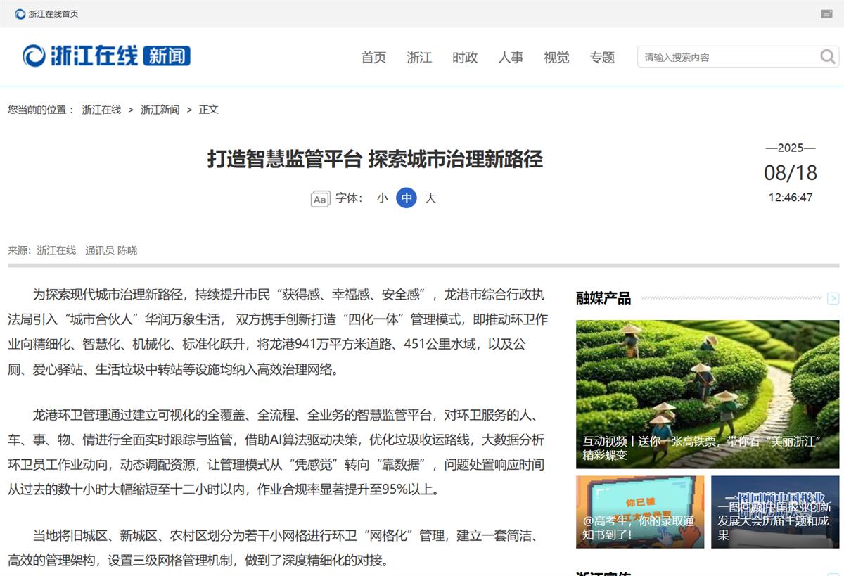 龍港六年的成長(zhǎng)路,亦是潔亞環(huán)保與城市共獲認(rèn)可的奮斗路。項(xiàng)目啟動(dòng)至今,我們的工作多次登上浙江在線、浙江之聲等省級(jí)媒體頭條,更獲 “學(xué)習(xí)強(qiáng)國(guó)” 平臺(tái)、浙江省住建廳專(zhuān)題報(bào)道,累計(jì)收獲市級(jí)以上官方報(bào)道 20 余次——這些筆墨,既是對(duì)我們推動(dòng)城市環(huán)境升級(jí)的記錄,更是外界對(duì)龍港治理模式的肯定。