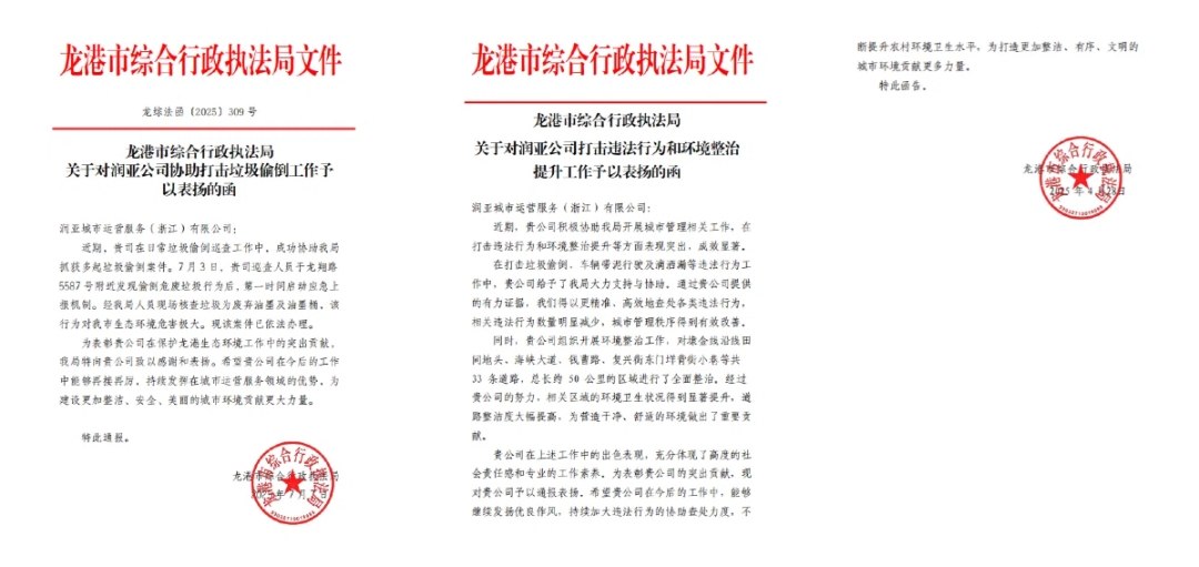 來(lái)自委托方與基層的信任更顯分量:龍港市綜合行政執(zhí)法局先后發(fā)來(lái)多封表?yè)P(yáng)信,在 2024 年 4 月的函件中特別提及,“積極協(xié)助開(kāi)展城市管理工作,在打擊違法行為、環(huán)境整治提升中表現(xiàn)突出,成效顯著”;基層的認(rèn)可則更暖人心:下澇社區(qū)、池浦社區(qū)、舥艚第一社區(qū)等先后送來(lái) 10 余面錦旗,“清潔先鋒,服務(wù)為民”“不畏寒暑凈街巷,平凡崗位創(chuàng)非凡” 的字句,是居民對(duì)我們工作最真摯的點(diǎn)贊。