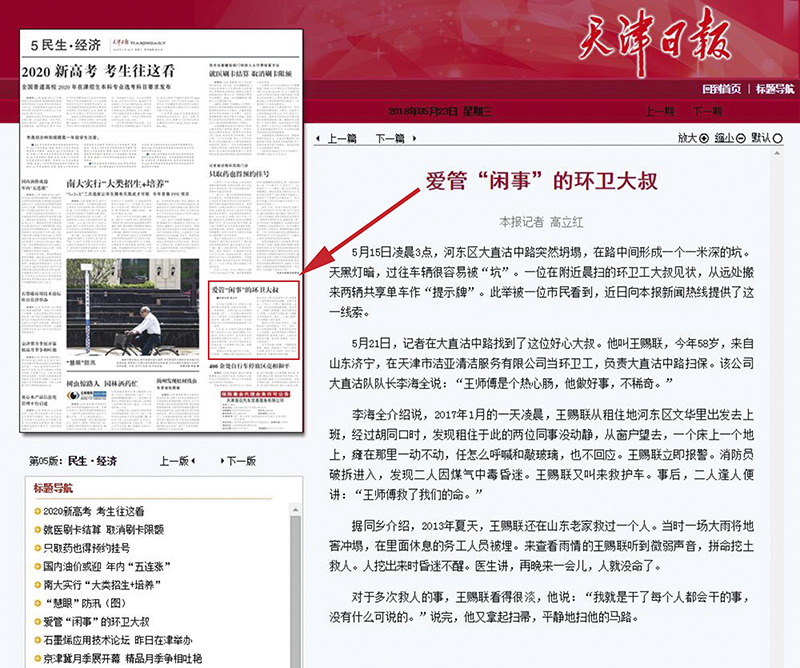 “大道之行,天下為公”,多年來,潔亞公司一直致力于公益事業(yè),先后成立潔亞黨支部、團(tuán)支部、工會(huì)、義工服務(wù)小組、志愿者隊(duì)伍等組織,從上到下,力所能及地為社會(huì)貢獻(xiàn)自己的一份力量,不斷涌現(xiàn)出見義勇為、好人好事, 這不,天津市潔亞清潔服務(wù)有限公司又有一位愛管“閑事”的環(huán)衛(wèi)大叔,天津日報(bào)、天津市場信息報(bào)、新華網(wǎng)、人民網(wǎng)、北方網(wǎng)、大眾網(wǎng)等主流媒體相繼報(bào)道了此事,原文如下: