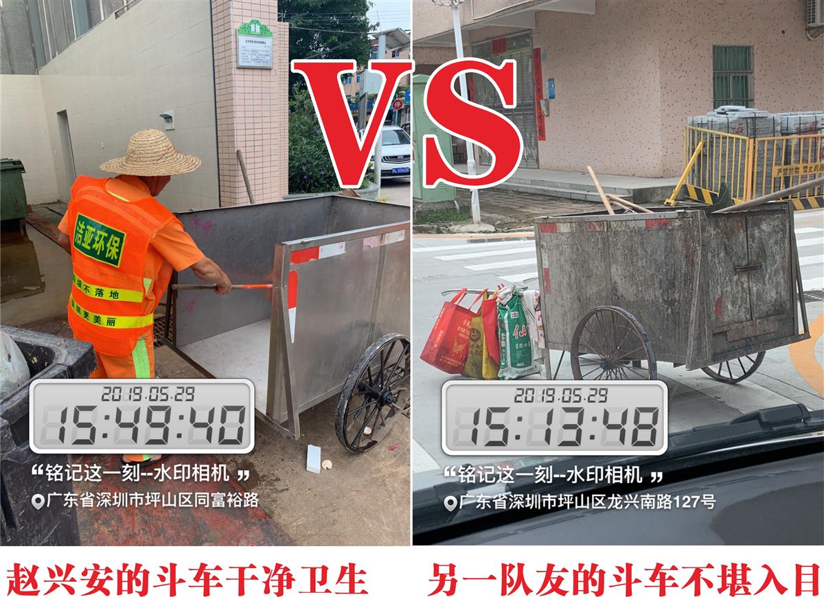值得一提的是那天檢查龍?zhí)镆魂爼r,發(fā)現(xiàn)了二個極端,其中有一個員工的斗車已經(jīng)銹跡斑斑、臟亂不堪,從來沒有清潔過,根本看不出來是不銹鋼的斗車,嚴(yán)重影響了公司的形象?!耙晃莶粧?,何以掃天下”,自己的環(huán)衛(wèi)工具都不清潔,又怎么能把環(huán)衛(wèi)工作做好!另一個極端就是趙興安最干凈最漂亮的斗車,形成了極其鮮明的對比。