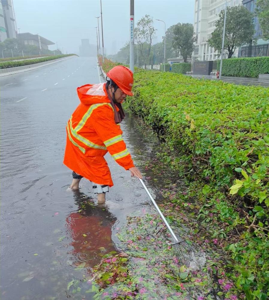 臺(tái)風(fēng)過(guò)境期間,倒伏樹(shù)木、折斷枝椏隨處可見(jiàn),部分路段出現(xiàn)內(nèi)澇。搶險(xiǎn)隊(duì)采用“機(jī)械破障+人工精修”模式,邊清邊運(yùn),優(yōu)先打通主干道;隊(duì)員徒手清掏被枯枝、泥沙堵塞的雨水口,在低洼點(diǎn)定人定崗,保障排水通暢。